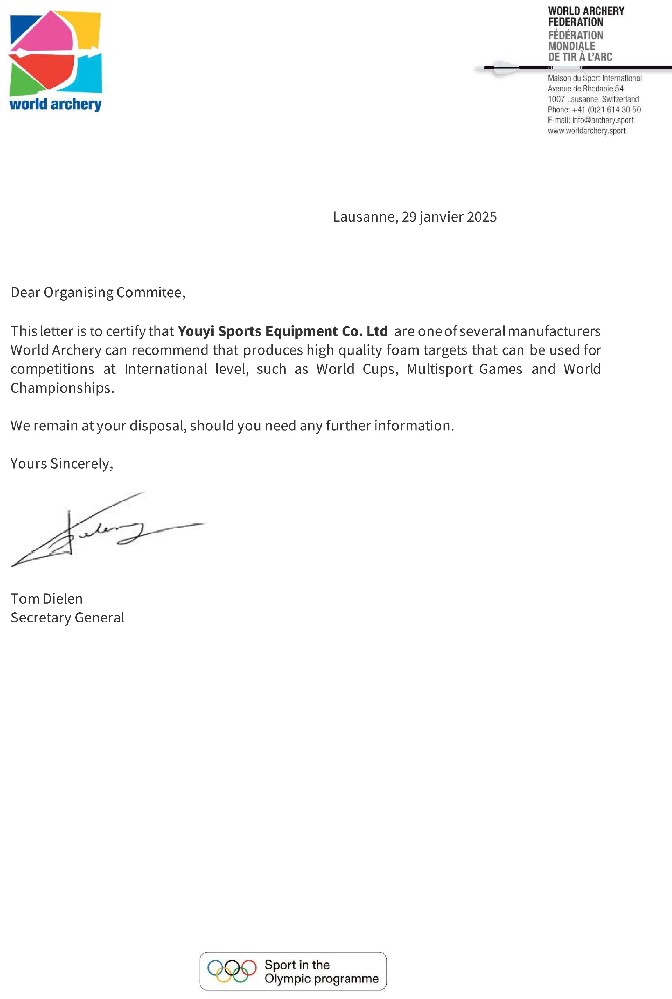 目前,主要生產和銷售射箭比賽訓練專用器材,包括:箭靶、靶紙、靶架、號碼牌、風向旗、計時記分器等場地器材設備;反曲弓、復合弓、傳統(tǒng)弓、瞄準器、防震桿等弓箭裝備;箭壺、護胸、護臂、護指等各類箱包護具。公司所生產的射箭器材已通過國際射箭聯(lián)合會及中國射箭協(xié)會CAA認證。